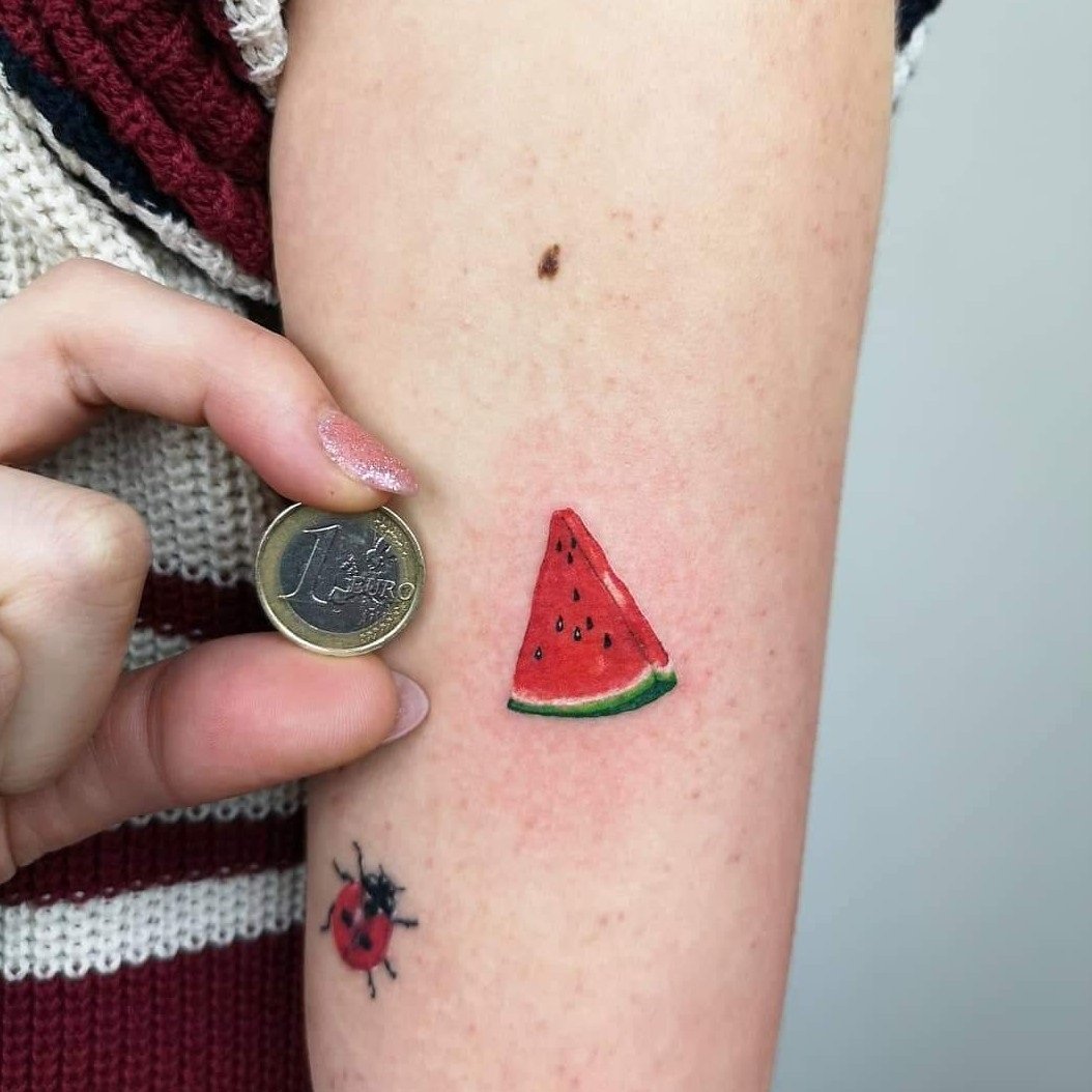 Taki tatuaż byłby odpowiedni na ciele wesołej osoby, która nie boi się tego zadeklarować. Czerwony kolor miąższu natychmiast przyciąga uwagę, podobnie jak osoba nosząca taki tatuaż.