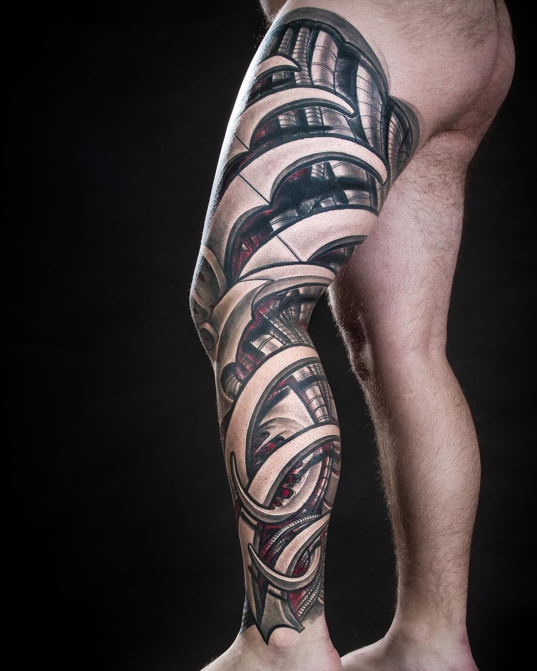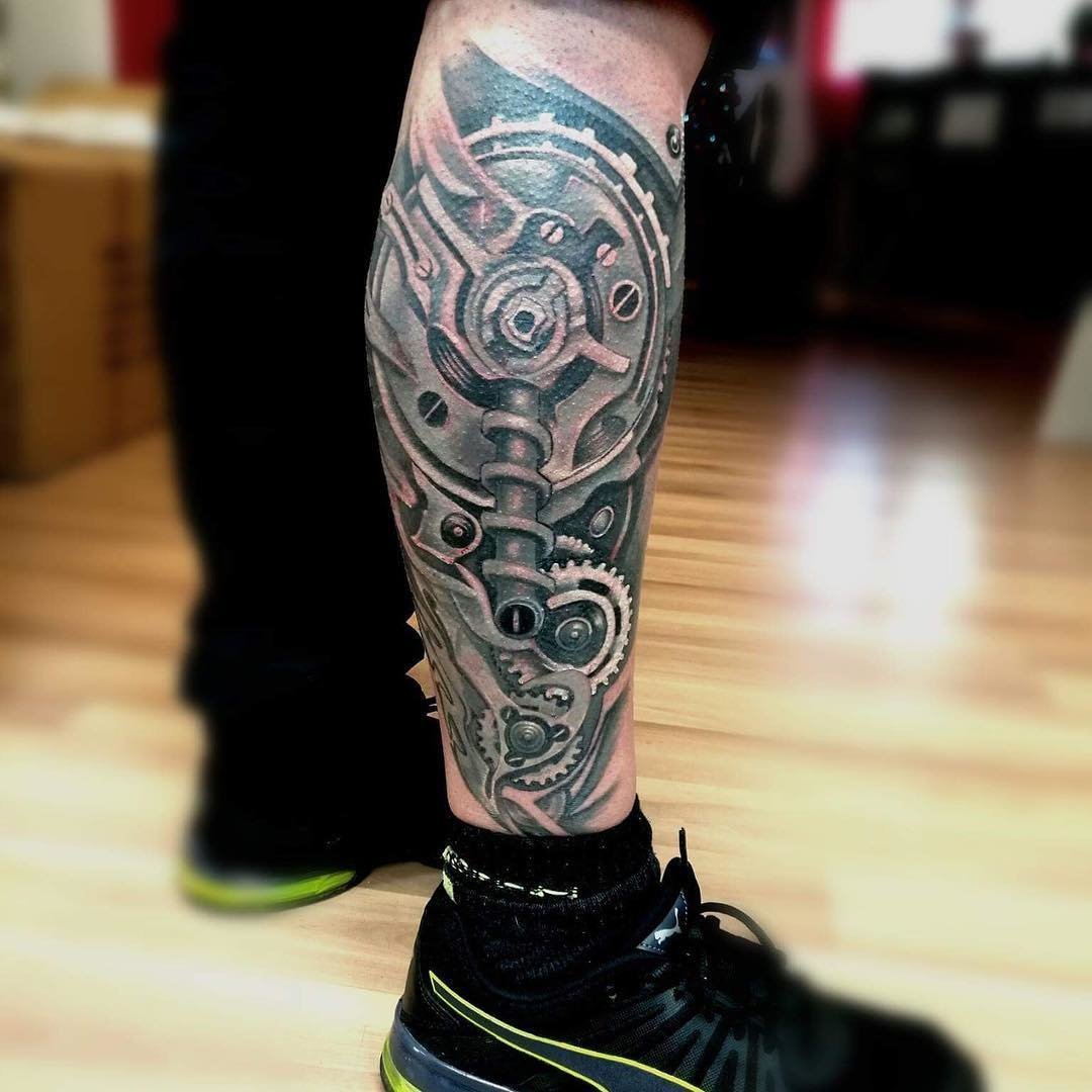 Tatuaże biomechaniczne są często przedstawiane na nogach. Dziewczyny wolą ozdabiać biodra w ten sposób, ale mężczyżni wolą bardziej tatuaże na dolnych częściach nóg. W męskiej wersji tego tatuażu mechanizmy stają się bardziej wyrysowane, istnieje lepiej widoczny i wyraźny zarys mięśni.