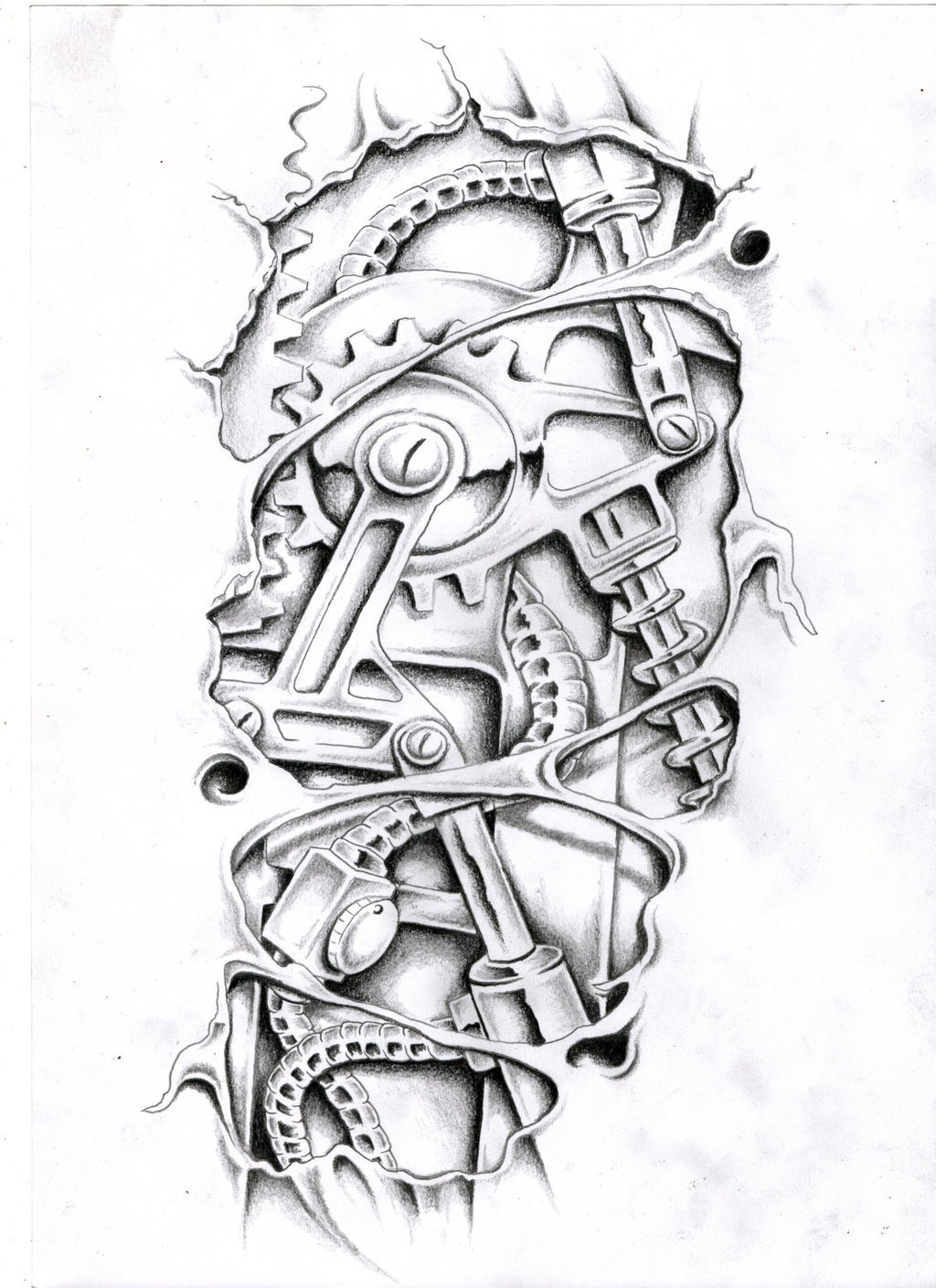 Z reguły szkice wyglądają w ten sposób: podarta skóra jest rysowana na ciele człowieka i przez otworzy w skórze widoczny jest mechanizm. Wszystkie elementy mechanizmu (nakrętki, druty, sprężyny, tłoki, śruby i tak dalej) wyglądają bardzo naturalnie, co nadaje temu stylowi wyjątkowy charakter.
