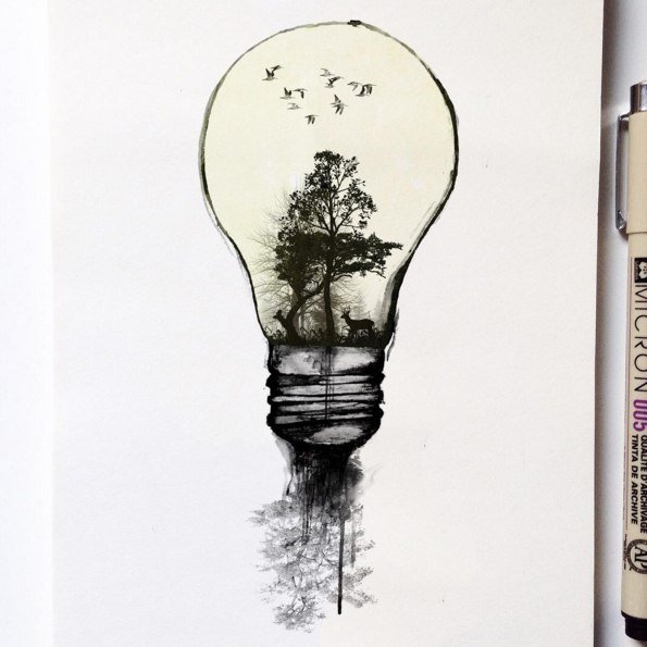 Ponadto są prace wykonywane z punktu widzenia estetyki, gdzie cały świat znajduje się w lampie: może to być dno oceanu, pustynia, miasto lub prowincja, a nawet cała planeta. Żarówka może zawierać wszechświat, podobnym logo posługują się zwolennicy ochrony przyrody.