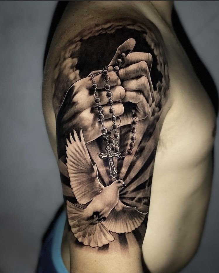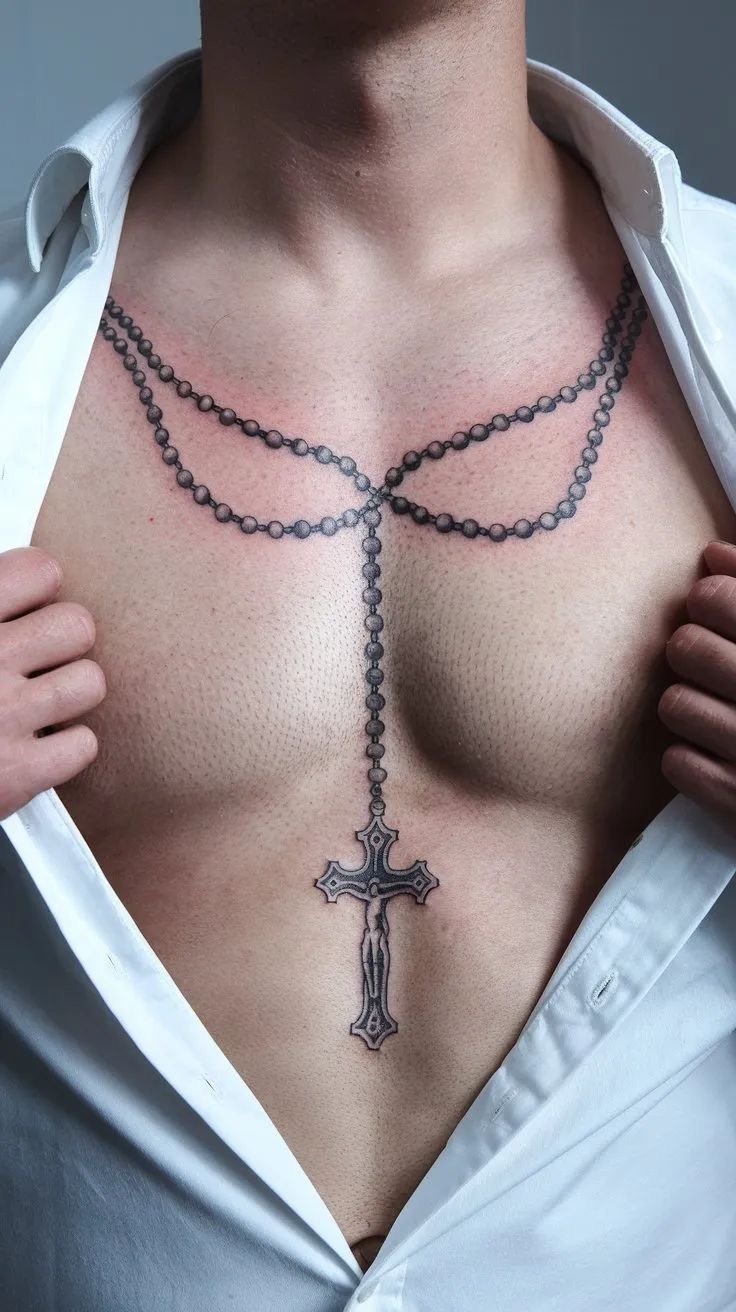 Tatuaż różaniec dla mężczyzn to wyraz męskiej siły duchowej, odwagi w wyznawaniu wartości oraz gotowości do obrony zasad chrześcijańskich.