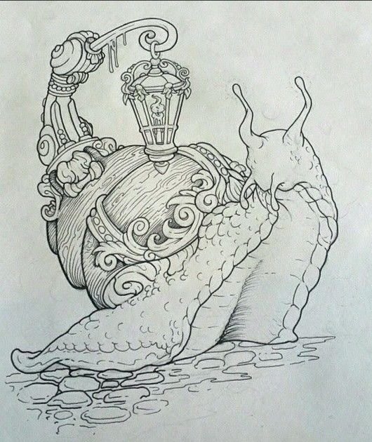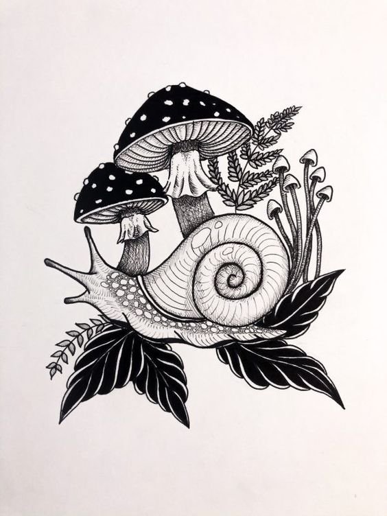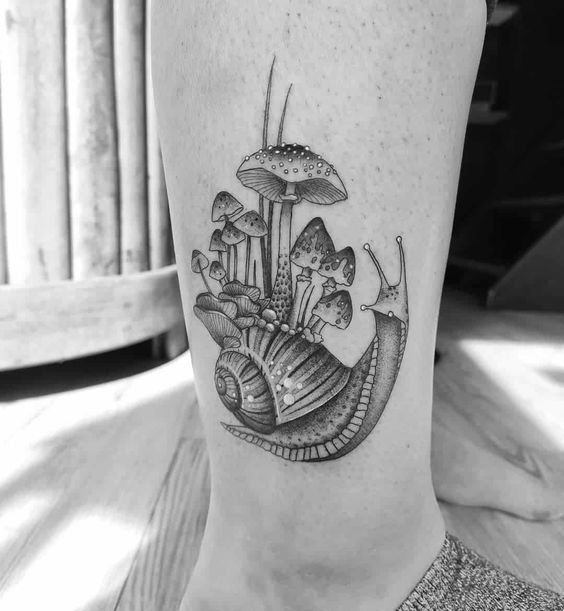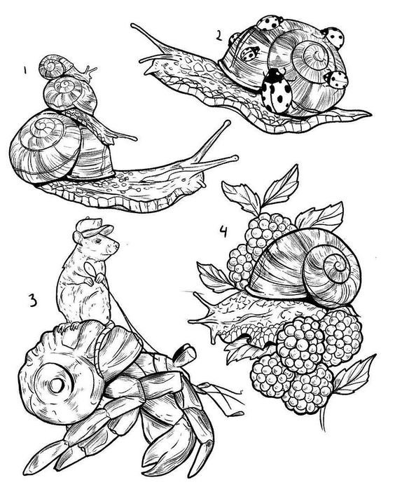 Często szkic tatuażu ślimaka jest uzupełniany różnymi elementami i rysunkami, tworząc cały obraz. Do tego tatuażu idealne są takie szczegóły, jak kwiaty, liście, często zamiast muszli tatuażyści przedstawiają mały dom.