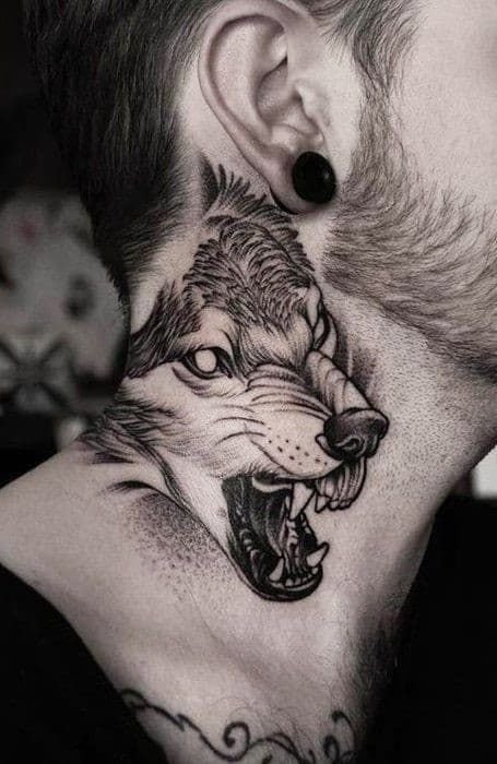 - Tatuaż na szyi z tą dziką bestią nawiązuje do pierwotnych instynktów, męskości, a także do idei materializmu. Wilki symbolizują wrodzoną wolność, która jest także fundamentalna dla człowieka i często determinuje jego osobowość. Ten tatuaż jest ucieleśnieniem wielkiej siły mężczyzny, lojalności i połączenia z naturą. Dodając do szkicu księżyc, drzewa, symbole plemienne lub runiczne, możesz stworzyć prawdziwy gobelin na szyi, który opowie światu osobistą historię i wartości jego właściciela.