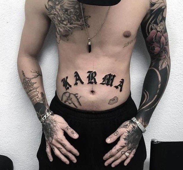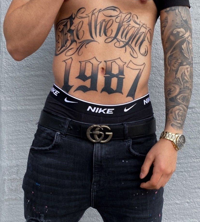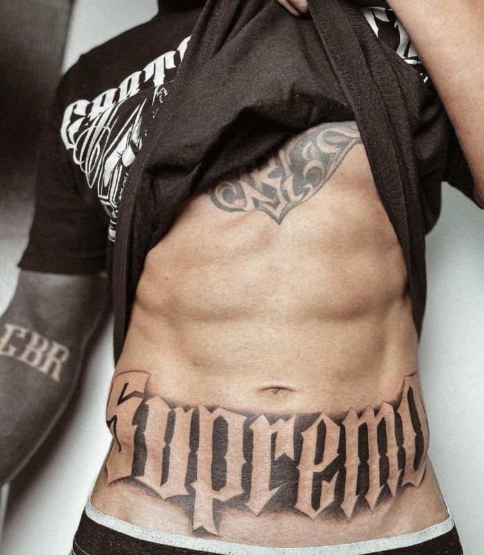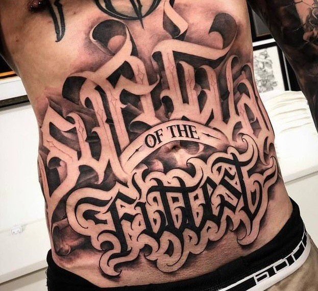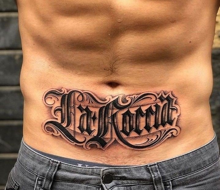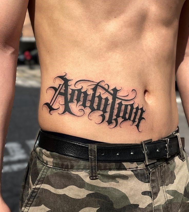 Tatuaż na brzuchu męski napis dobrze prezentuje się w centralnej linii, nad pępkiem lub symetrycznie po bokach. Styl pisma może być gotycki, maszynowy lub kaligraficzny.
