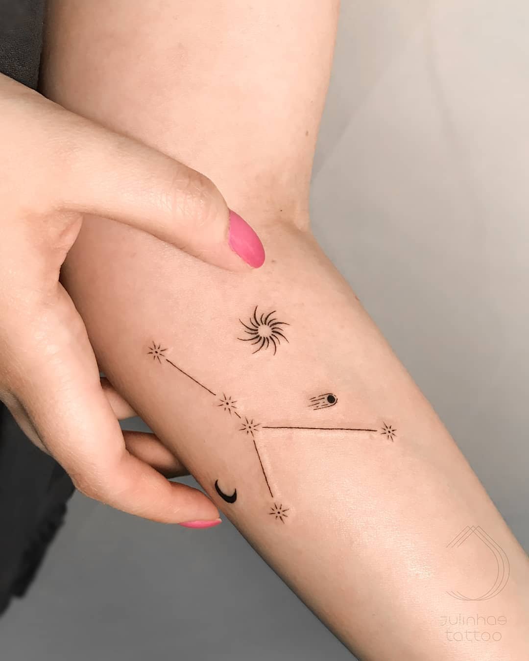 - Magiczny i czarujący księżyc, który rządzi i odżywia ten znak zodiaku. Kierowana tym kosmicznym ciałem, estetyka sztuki ciała Raka ma zazwyczaj kobiecy charakter. -Minimalistyczny wzór księżyca otoczonego gwiazdami może symbolizować marzenia i intuicję. Ten tatuaż spodoba się również osobom, które mają słabość do motywów kosmicznych.