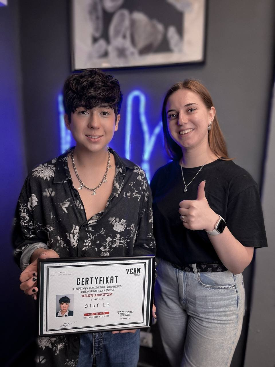 List polecający od VEAN Tattoo wydawany jest na żądanie i potwierdza twoje kwalifikacje przed potencjalnymi pracodawcami lub klientami, szczególnie w USA i Kanadzie. Aktywnie rozwijamy nasze kontakty na tych rynkach, zapewniając naszym absolwentom dodatkowe możliwości rozwoju kariery. List zawiera kluczowe aspekty twojego szkolenia i umiejętności, co czyni go bezcennym narzędziem w promowaniu twojej kariery.